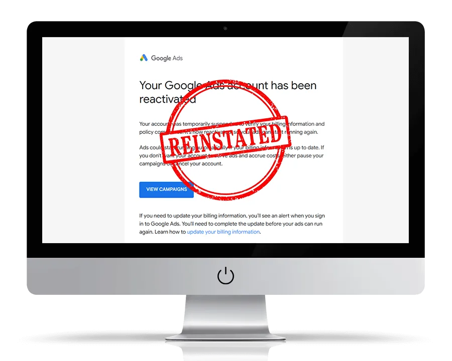 Done-for-you reinstatement. 98%+ success rate. 100% money-back guarantee. Take the quick 2 minute suspension survey now — let’s fix your suspension, get you reinstated, and put your ads back where they belong.
